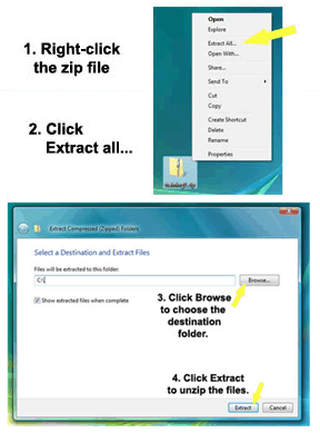 or extract). The screen shot on the right illustrates how to unzip